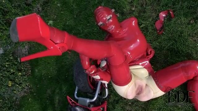 Баба в латексе мастурбирует пизденку пальцами на газоне