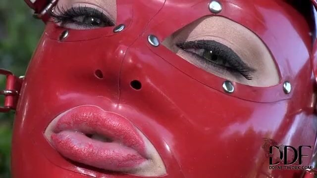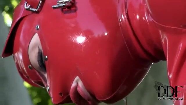 Грудастая рабыня в латексе мастурбирует пальцами в саду
