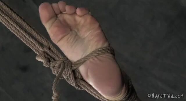 Черный хулиган связывает рабыню с выбритой пиздой и ощупывает