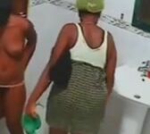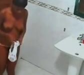 Войдя в ванную комнату, чернокожая барышня разделась до трусов и начала сексуально позировать перед зеркалом. Вскоре к телочке пристроилась какая-то толстушка, прогладила гладкий животик и убежала в неизвестном направлении.