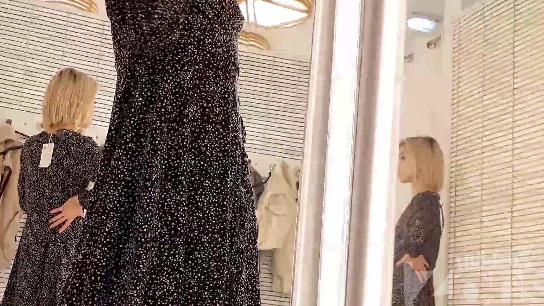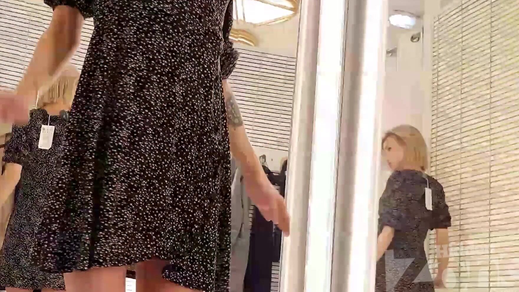 Выбрав короткое платье, симпатичная худышка помчалась примерять дорогой товар в кабинку. Обнажившись, цыпочка покрутила розовой попкой перед зеркалом, а затем накинула на классное тело откровенный наряд.