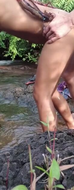 Ополоснувшись в небольшой реке, обнаженные японцы принялись ебаться в воде. Девушка покорно стояла в любимой секс позе, пронзительно постанывала и позволяла близкому другу засаживать на максимальную длину.