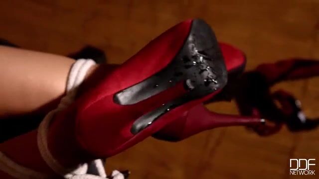 Злодей стягивает с пленницы трусики и привязывает к полу