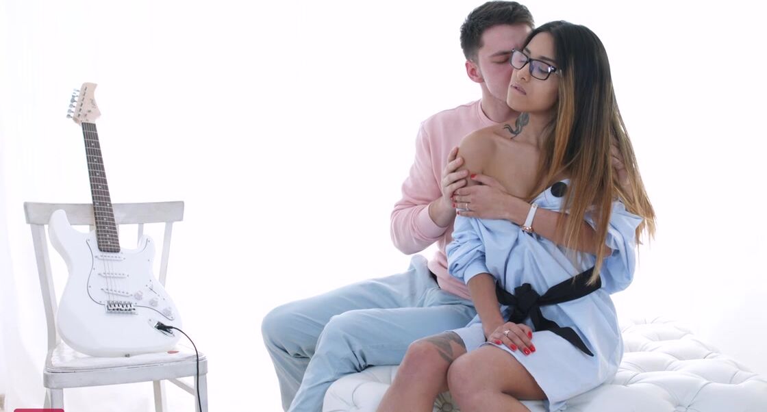 Очаровательная молодая девушка в очках сегодня проводит время со своим приятелем и послушав его игру на гитаре, деваха решает отдаться пареньку и незабываемо провести с ним время. Похотливая негодница занимает позицию поудобней и принялась надрачивать венистый стояк губками и ручками, ну а потом уже спускает трусики и отдается в свои дырочки. Похотливый парнишка засаживает сначала в гладко выбритую вагину своей красавицы, ну а потом уже дрючит ее от души в тугую задницу, пока не кончит как следует.