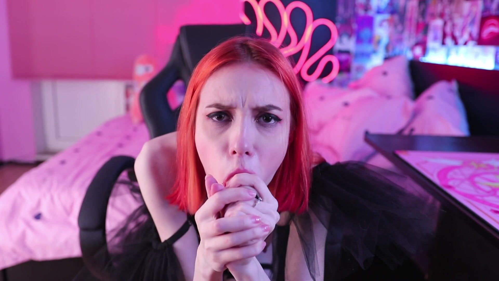 Молодая рыжая распутица очень худа и миниатюрна, но дилдо в ее руках солидного размера. Такую секс игрушку негодница сладко облизывает на камеру и даже жадно запихивает в глотку, ведь знакома с глубоким минетом. Но пора шлюшке раздвинуть ножки и шикарно подрочить. Мастурбация вынуждая девушку громко стонать, от чего мощный оргазм происходит со сквиртом.
