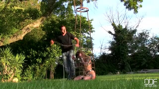 Татуированная рабыня в металлической клетке сильно возбуждает хозяина