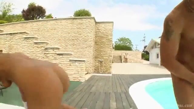 Баба с выбритой писькой шикарно трахается возле бассейна